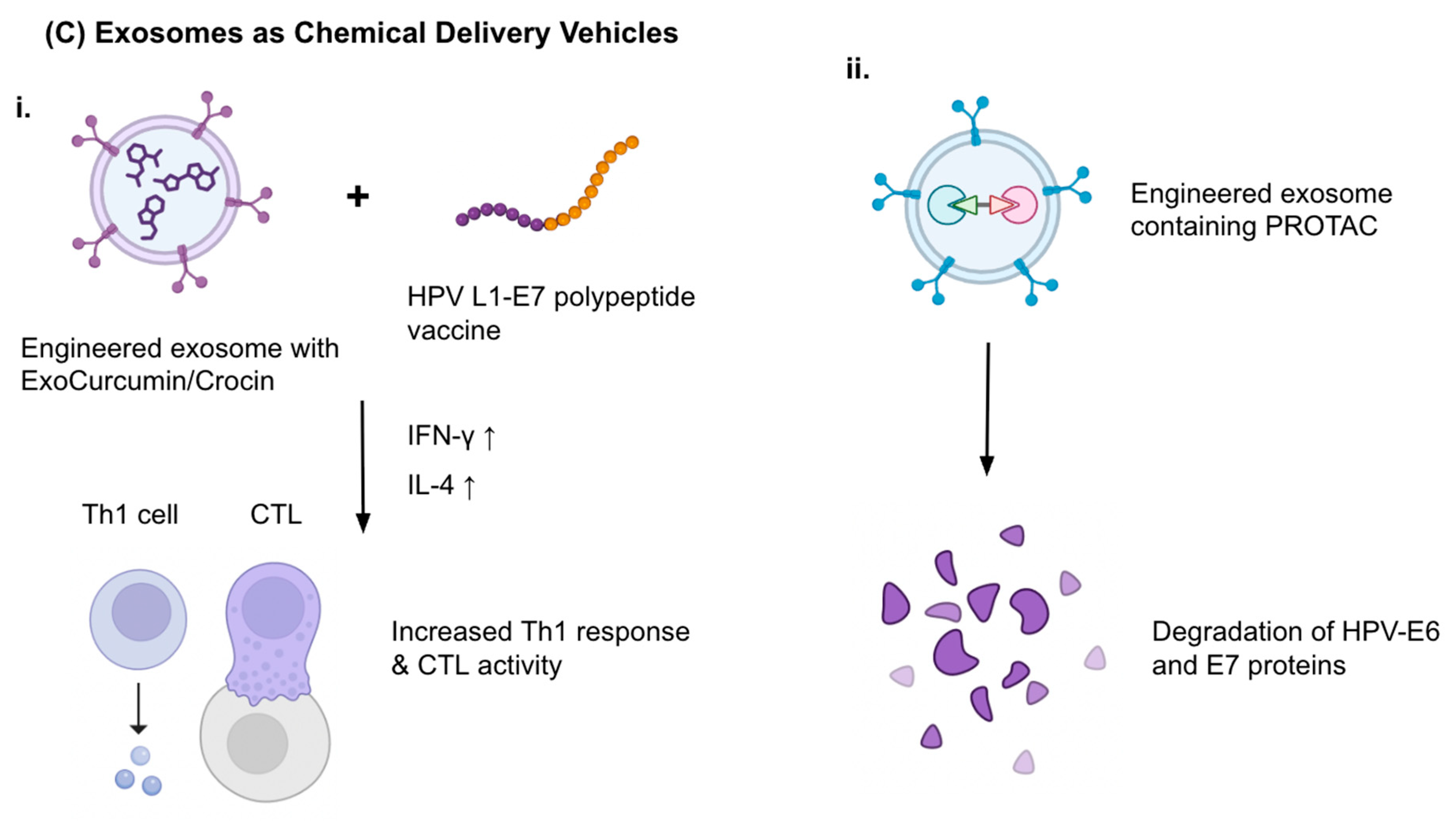 Exosomal PROTACs | E6/E7 degraders | Oncoprotein elimination | Theoretical model (HPV-related) | Targeted degradation | Mukherjee et al., 2024 [79] |