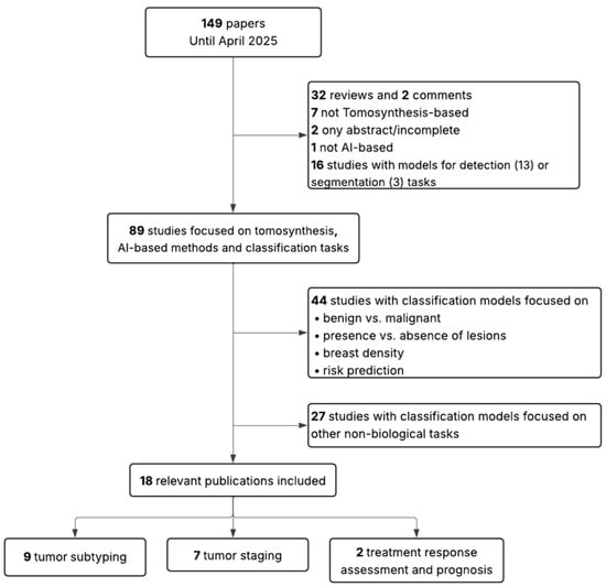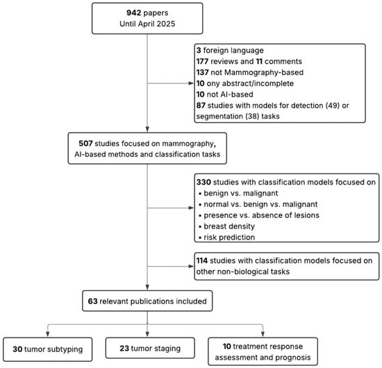 The initial search yielded 942 articles for MM and 149 for BT. The same inclusion and exclusion criteria were applied to both sets. In the first stage, articles were excluded if they were not in English, if they were reviews, editorials, incomplete studies, or abstracts only. Studies that were not AI-based, not focused on MM or BT, or addressed detection or segmentation tasks rather than classification were also discarded. In the second stage, studies limited to binary classification tasks not directly related to the scope of this review (such as benign versus malignant lesion classification, presence or absence of lesions, breast density assessment, or general risk prediction) were excluded. Additionally, papers were excluded when their primary aim, despite involving classification, was the evaluation of other aspects such as radiomic stability, image quality, methodological validation, simulations, report generation, clinical performance assessment, or image reconstruction (in BT).