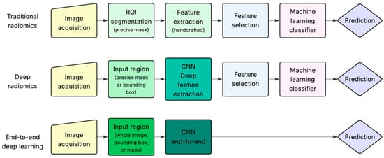As previously mentioned, this review focuses on studies that applied AI methods to extract biological characteristics of breast tumors from imaging data. These AI-based approaches can be broadly categorized into three groups: traditional radiomics, deep radiomics and end-to-end deep learning (DL), as illustrated in Figure 3.