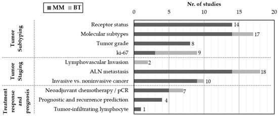 Distribution of studies by imaging modality (MM or BT) and clinical target. Studies were grouped into three main categories: tumor subtyping, tumor staging and treatment response/prognosis.