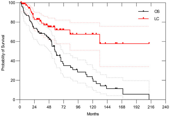 Overall survival and local control rates in patients with RPS treated with CIRT. In 76 patients, the 3- and 5-year OS rates were 68.3% (95% CI, 56.5–77.5%) and 49.4% (95% CI, 36.7–60.9%), respectively. Meanwhile, the 3- and 5-year LC rates were 79.0% (95% CI, 66.4–87.3%) and 72.0% (95% CI, 57.7–82.1%), respectively. The dotted lines represent the 95% confidence intervals.