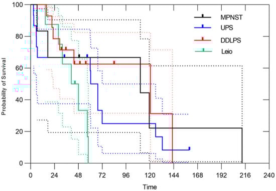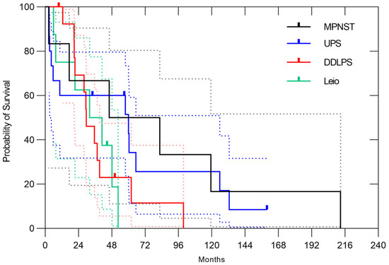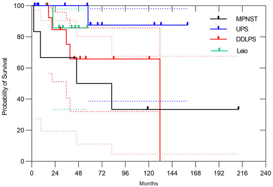 In all cases, the 3-year OS rates were 66.7% (95% CI, 19.5–90.5%) in MPNST, 66.7% (95% CI, 37.5–84.6%) in UPS, 71.4% (95% CI, 40.6–88.2%) in DDLPS, 62.5% (95% CI, 22.9–86.1%) in leiomyosarcoma, respectively. The dotted lines represent the 95% confidence intervals.