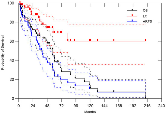 In the entire cohort, the 3- and 5-year overall survival (OS) rates were 68.3% (95% CI, 56.5–77.5%) and 49.4% (95% CI, 36.7–60.9%), respectively. The median overall survival time was 58.1 months (range, 2.3–212.8 months). The 3- and 5-year LC rates were 79.0% (95% CI, 66.4–87.3%) and 72.0% (95% CI, 57.7–82.1%), respectively (Figure 1). Among the 56 patients who experienced treatment failure, the initial failure site was local recurrence in 10 cases (18%), abdominal recurrence excluding local recurrence in 20 cases (36%), and distant metastasis in 21 cases (38%). Simultaneous failures at multiple sites occurred in 5 cases (9%). The lung was the most common site of distant metastasis in 19 patients, including both cases with initial recurrence limited to the lung and those with simultaneous recurrence at multiple sites. The 3-year and 5-year ARFS rates were 50.2% (95% CI, 38.3–61.0%) and 33.8% (95% CI, 22.8–45.2%), respectively, with a median ARFS time of 39.2 months. The 3-year and 5-year disease-free survival (DFS) rates were 39% (95% CI, 27.9–49.7%) and 23% (95% CI, 13.7–32.9%), respectively.