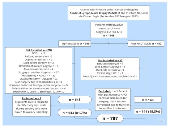 Between 1 September 2013, and 31 August 2023, a total of 1108 clinical history records of patients who underwent SLNB at the UFM-INC were reviewed. After reviewing these records, 793 patients met the study inclusion criteria. Six patients were excluded from this group: five due to a lack of SLN identification, and one from the Post-NACT SLNB group because she was transferred to another institution after completing systemic treatment. A total of 787 patients were ultimately included: 81.7% (n = 643) underwent Upfront SLNB, while 18.3% (n = 144) underwent Post-NACT SLNB. Figure 1 details the reasons for exclusion from the final analysis.