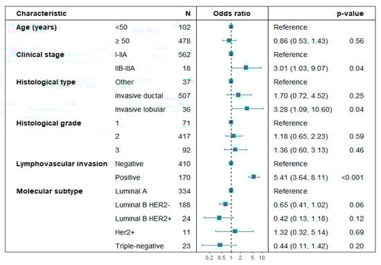 Predictive factors for SLN positivity: Age, histological grade, and molecular subtype were not linked to SLN positivity in the subset of patients who underwent Upfront SLNB. In unadjusted logistic regression analysis, locally advanced clinical stages IIB–IIIA (p = 0.03), lobular histology (p = 0.03), and lymphovascular invasion (LVI) (p < 0.01) were associated with positive SLN (Table 3). In the adjusted logistic regression analysis, clinical stages IIB-IIIA (OR 3.01; 95% CI: 1.03–9.07; p = 0.04), lobular histology (OR 3.28; 95% CI: 1.09–10.60; p = 0.04), and LVI (OR 5.41; 95% CI: 3.64–8.11; p < 0.01) were significantly associated with SLN positivity (Figure 2). No multicollinearity problems were found in the variables included in the multivariate logistic regression model for predicting SLN positivity (Variance Inflation Factor -VIF < 1.5).