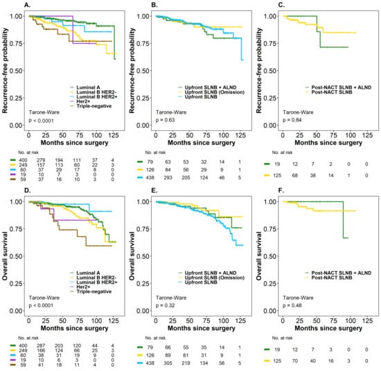 Time to recurrence (TR) and overall survival (OS) (Kaplan–Meier curves) in breast cancer patients according to molecular subtype and treatment type (Upfront SLNB and Post-NACT SLNB), considering axillary management. (A) Recurrence-free probability by molecular subtype (Luminal A, Luminal B HER2–, Luminal B HER2+, HER2+, and triple-negative). (B) Recurrence-free probability by axillary management in upfront surgery (Upfront SLNB + ALND, Upfront SLNB with omission, and Upfront SLNB). (C) Recurrence-free probability by axillary management in post-NACT surgery (SLNB post-NACT + ALND and SLNB post-NACT). (D) Overall survival by molecular subtype. (E) Overall survival by axillary management in upfront surgery. (F) Overall survival by axillary management in post-NACT surgery.