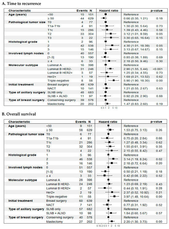 On the other hand, the adjusted or multivariate analysis, based on selected clinical and pathological characteristics, showed that tumor size (T2 vs. T0) (HR 3.12; 95% CI: 1.01–9.59; p = 0.05), histological grade 2 vs. 1 (HR 4.30; 95% CI: 1.01–18.4; p = 0.05), and the biological subtypes luminal B HER2-negative (HR 2.90; 95% CI: 1.55–5.44; p < 0.01) and triple-negative (HR 5.90; 95% CI: 1.90–18.3; p < 0.01), compared to luminal A, were significantly linked to a worse prognosis for breast cancer recurrence (Figure 4, panel A). For overall survival (OS), histological grade (grade 2 vs. grade 1) (HR 3.14; 95% CI: 1.19–8.24; p = 0.02), biological subtype (triple-negative vs. luminal A) (HR 3.97; 95% CI: 1.48–10.6; p < 0.01), and type of breast surgery (mastectomy vs. breast-conserving surgery) (HR 2.20; 95% CI: 1.30–3.73; p < 0.01) were significantly associated with an increased risk of mortality (Figure 4, panel B). No significant associations were identified for lymph node involvement, initial treatment type, or axillary surgery type in either outcome. Both models met the Cox proportional hazards assumption (Figure S1, Supplementary Material).