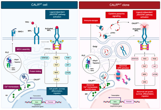 Mutations in CALR have shown to affect key aspects of cellular biology and immune regulation (Figure 1) [22,23,24]. Loss of the ER-retention KDEL sequence directs mutant CALR into the secretory pathway, enabling pathological MPL activation [4,5]. The altered C-terminal tail triggers an N-domain conformational change, exposing the N-glycan binding pocket for recognition of immature N-glycans on MPL [25]. Direct electrostatic interactions are also thought to occur between the positively charged residues in the mutant C-terminal domain and negatively charged residues within the D1 domain of MPL [25]. This interaction, occurring in the ER and Golgi, facilitates trafficking of the CALR–MPL complex to the cell surface, where mutant CALR acts as a cytokine mimic, promoting ligand-independent MPL dimerization and sustained JAK/STAT activation [19,26]. Additional data indicate that homomultimerization of mutant CALR, driven by its aberrant C-terminal sequence, is necessary for full receptor activation [25,27]. Mutant CALR was also detected in plasma of MPN patients [28]. Pecquet et al. [28] investigated its biological role and demonstrated a correlation between soluble mutant CALR (smCALR) levels and mutational burden. They further showed that the prolonged half-life of smCALR results from its complex formation with soluble transferrin receptor 1 (sTFR1). Functionally, smCALR probably binds to and activates MPL on megakaryocyte progenitor cells, promoting ligand-independent proliferation and sensitizing neighboring cells to CALR-mediated signaling.