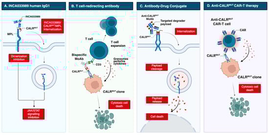 Additional antibodies are designed to recruit immune effector cells, mediating antibody-dependent cellular cytotoxicity (ADCC), antibody-dependent cellular phagocytosis (ADCP), and complement-dependent cytotoxicity (CDC). In 2023, Kuchnio et al. [50] reported JNJ-88549968, a bispecific T-cell–redirecting antibody selectively targeting MPN clones. This agent induced specific binding and T-cell activation against CALR-mutated cells in vitro, including autologous assays, and in xenograft models, regardless of mutation subtype; it is now in a phase 1 trial (NCT06150157).