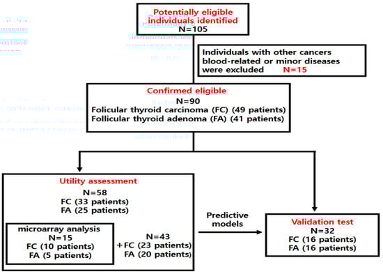 This study was a retrospective observational analysis. One hundred five patients who underwent thyroidectomy at the Department of Otorhinolaryngology, Pusan National University Hospital, between January 2013 and February 2024 were consecutively enrolled in this study. All patients were diagnosed with FC or FA based on final histopathological examination. Fifteen individuals with other cancers, blood-related or minor diseases were excluded. We analyzed plasma circulating microRNA from 90 patients diagnosed with FC or FA to identify novel microRNA biomarkers predictive of FC and to develop diagnostic prediction models. The study was conducted in three sequential phases: microarray, utility assessment, and validation test. To minimize selection bias, patients were enrolled consecutively and then randomly assigned to each cohort group. Blood samples were collected from patients who provided written informed consent before surgery, and no hemolyzed samples were included in the analysis. This cross-sectional study was approved by the Institutional Review Board of the Pusan National University Hospital (2307-014-129). Plasma samples were collected immediately prior to surgery and stored at −80 °C in an ultra-low temperature freezer, managed by Biobank of Pusan National University Hospital. Among the 90 patients, there were 49 patients with FC and 41 patients with FA. Fifty-eight were enrolled in a study to evaluate the utility of plasma miRNAs for distinguishing between FA and FC as the utility assessment. Among the 58 patients included in the utility assessment, microarray analysis was conducted on 15 individuals who were randomly selected to identify novel plasma miRNAs prior to utility assessment. In addition, other 32 patients were enrolled in a study to validate the accuracy of the constructed predictive models that were determined to be useful (Figure 1). There were no statistical differences in sex ratio, age and tumor size among the three cohorts (Microarray, Utility assessment, validation test). Detailed epidemiological information for each study group is presented in Table 1 and Table 2.