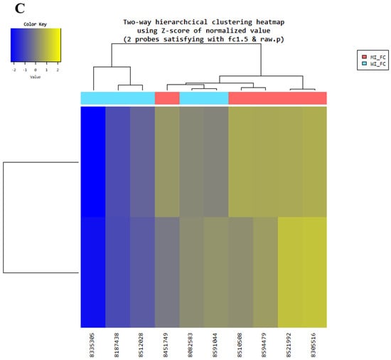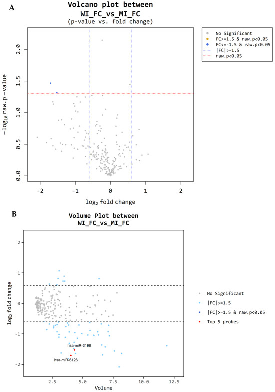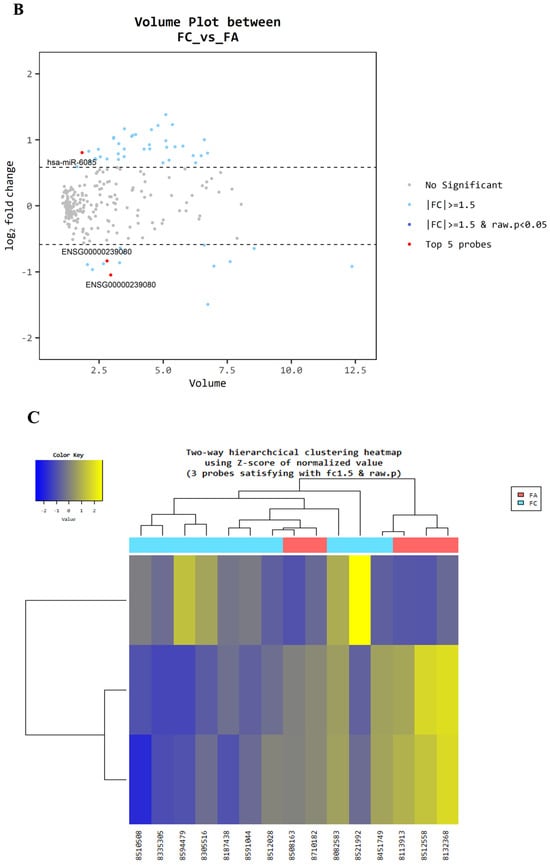 Among the 10 patients with FC, microarray analysis was also performed on plasma samples from each of the five patients with WI-FC and MI-FC. Differential expression analysis using volcano and volume plots (Figure 5A,B) revealed two miRNAs exhibiting greater than 1.5-fold changes in expression between the two groups, with statistical significance (p < 0.05). We performed hierarchical clustering and created a heatmap to visualize the results (Figure 5C). Two miRNAs, miR-3196 (miRBase Accession Number: MI0014241, CGGGGCGGCAGGGGCCUC) and miR-6126 (miRBase Accession Number: MI0021260, GUGAAGGCCCGGCGGAGA), were identified as significantly downregulated in the WI-FC group relative to the MI-FC group.