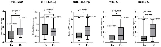 Relative miRNA expression of follicular thyroid adenoma and carcinoma. This graph compares the fold changes in the five miRNAs between follicular thyroid carcinoma (FC) and follicular thyroid adenoma (FA). * denote statistical significance: * indicates p < 0.05, and **** indicates p < 0.0001. Significant upregulation of miR-6085, miR-146b, miR-221, and miR-222 expression was also observed.