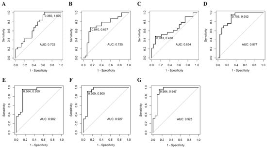 Diagnostic models for predicting follicular thyroid carcinoma. (A): model 1-1 (miR-6085), (B): model 1-2 (miR-146b-5p), (C): model 1-3 (miR-221), (D): model 1-4 (miR-222), (E): model 2-1 (miR-221 + miR-222), (F): model 3-1 (miR-6085 + miR-221 + miR-222), (G): model 4 (miR-6085 + miR-146b-5p + miR-221 + miR-222). Model 1-4 (miR-222) was the most predictive model among 4 single miRNA models. The model combining all miRNAs (Model 4) showed the most powerful ROC curve for predicting follicular thyroid carcinoma. The predictive power tended to increase when more miRNAs were included in the model.