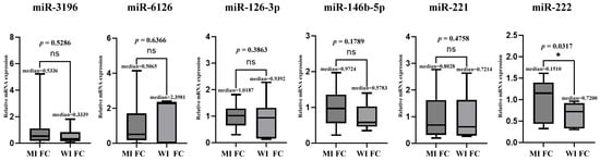 For each patient with WI-FC (n = 8) and MI-FC (n = 25), the TaqMan qRT-PCR assay was performed to examine the expression levels of miR-3196 and miR-6126, as well as miRNAs previously reported to be upregulated in FC (miR-126-3p, miR-146b-5p, miR-221, and miR-222). The results showed that miR-222 was downregulated in the WI-FC group compared to the MI-FC group. However, no statistically significant differences were observed in the expression levels of the remaining five miRNAs between the two groups (Figure 6). In the microarray analysis, miR-3196 and miR-6126 were downregulated compared to those in MI-FC. Decreasing plasma miRNA levels have limitations in their use as biomarkers for clinically identifying cancer. Moreover, due to the small number of patients with WI-FC and the lack of significance of miRNAs in the TaqMan assay, further predictive examinations were not conducted.