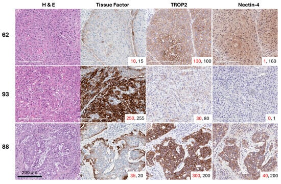 Representative images of three usual squamous cell carcinoma subtype PSCC tumor tissues with variable expression of tissue factor (TF), TROP2, and nectin-4. The membrane H-score is shown in red font, while the cytoplasmic H-score is displayed in black font for each core in the lower-right corner of each image.