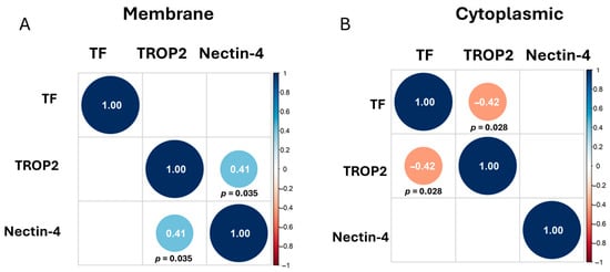 Correlation Matrices. Correlations that are off the diagonal are statistically significant, with positive correlations shown in light blue circles and negative correlations shown in orange circles. Adjusted p-values were determined using Benjamini–Hochberg correction and are written below diagonal circles. Correlation plot of the membrane staining (A) and of the cytoplasmic staining (B) of TF, TROP2, and nectin-4 shown.