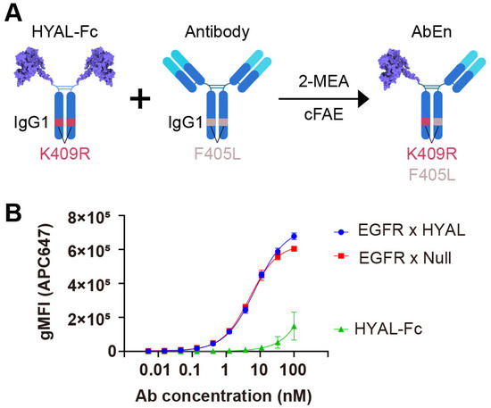 Engineering of an antibody–enzyme conjugate. (A) Schematic illustration of the generation of an antibody–enzyme conjugate (AbEn) via cFAE. The hyaluronidase-Fc fusion protein containing K409R mutation was incubated with an IgG1 molecule harboring matching F405L mutation in the presence of 2-MEA. (B) Concentration–response curves of the AbEn molecule binding to HCC827 cells were analyzed with Prism 8.0 using a four-parameter logistic equation. The data were presented as the mean ± SEM values of at least three independent experiments. The curve for EGFR × HYAL AbEn were shown in blue. The EGFR × Null antibody (red) and HYAL-Fc IgG1 fusion protein (green) served as the positive and negative controls, respectively. The abbreviations used: gMFI, geometrical mean fluorescent intensity; SEM, standard error of the mean; Fc, fragment crystallizable; AbEn, antibody–enzyme conjugate; cFAE, controlled Fab-arm exchange; 2-MEA, 2-mercaptoethylamine.