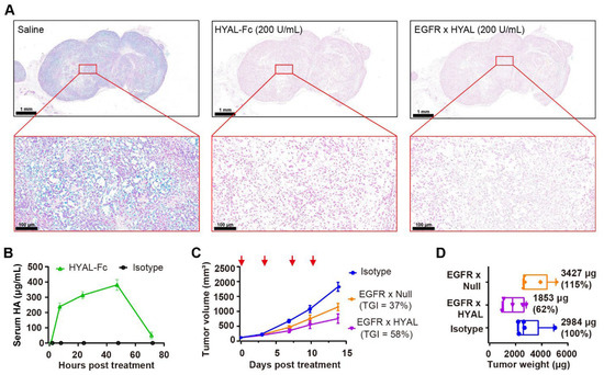 AbEn demonstrated effective depletion of HA both ex vivo and in vivo. (A) Alcian Blue staining of RKO tumor sections revealed changes in HA content following treatment with HYAL-Fc IgG1 fusion protein and EGFR × HYAL AbEn at a concentration of 200 U/mL for 2 h at 37 °C. The saline treatment served as a negative control. Alcian Blue specifically stained HA in the tissues (blue staining). The scale bars spanned for the top images, 1 mm; and for the bottom images, 100 μm. (B) Time course of serum HA fragment levels after a single intratumoral injection of 1 mg/kg HYAL-Fc IgG1 fusion protein in mice bearing subcutaneous RKO tumors. Blood samples (20 μL) were collected at 2, 8, 24, 48, and 72 h post-administration, and serum HA fragments were quantified via ELISA. Each time point included the mean values of n = 3 mice. An IgG1 isotype control was used as a negative control. (C) Tumor growth curves of RKO xenografts treated with either IgG1 isotype control (blue), EGFR × Null (orange), or EGFR × HYAL (purple) at 5 mg/kg, administered twice weekly for a total of four doses. The red arrows indicated the specific dosing days. Tumor growth inhibition rates were calculated relative to the isotype control for each treatment group for comparison. n = 5 mice per group. (D) On day 14, the animals were sacrificed, and the respective tumor weights were measured. Tumor weights were normalized to the isotype control for comparison. n = 5 tumors per group. The abbreviations used: HA, hyaluronic acid; TGI: tumor growth inhibition; HYAL, hyaluronidase; EGFR, epidermal growth factor receptor; AbEn, antibody–enzyme conjugate.