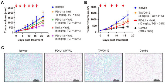 Targeted hyaluronidase enhanced the anti-tumor activities. (A) Tumor growth curves of RKO xenografts treated with IgG1 isotype control (blue), PD-L1 × Null (orange), or Null × HYAL (red) at 6 mg/kg, and PD-L1 × HYAL at 1 mg/kg (green) and 6 mg/kg (purple), administered twice weekly for six doses. Tumor growth inhibition rates were calculated relative to the isotype control for each treatment group. Each group included n = 5 mice. The red arrows indicated the specific dosing days. (B) Tumor growth curves of RKO xenografts treated with IgG1 isotype control (blue), TAVO412 (orange, 3 mg/kg for 4 doses and 5 mg/kg for fifth dose), PD-L1 × HYAL (red, 10 mg/kg), and the combination of PD-L1 × HYAL and TAVO412 (black), administered twice weekly for a total of five doses. The TGI rates were calculated relative to the isotype control for comparison. Each group included n = 5 mice. The red arrows indicated the specific dosing days. (C) Alcian Blue staining of RKO tumor sections demonstrated changes in hyaluronic acid (HA) content following treatment with IgG1 isotype control, PD-L1 × HYAL, TAVO412, the combination of PD-L1 × HYAL and TAVO412 (5 mg/kg). The scale bars spanned 100 μm. The abbreviations used: TGI, tumor growth inhibition; Combo, combination; HYAL, hyaluronidase.