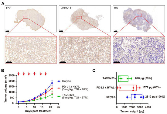 Targeted hyaluronidase delivery to stroma targets improved anti-tumor activity. (A) Representative immunohistochemistry images of RKO tumor sections showing FAP, LRRC15, and HA expression. The scale bar spans 100 μm. (B) Tumor growth curves of RKO xenografts treated with IgG1 isotype control (blue), PD-L1 × HYAL (red), or TAVO423 (green) at 5 mg/kg, administered twice weekly for six doses. Tumor growth inhibition rates were calculated relative to the isotype control. The data show an average of n = 5–6 mice per group. The red arrows indicate the specific dosing days. (C) On day 21, the animals were sacrificed and the respective tumor weights were measured. Tumor weights were normalized to the isotype control for comparison. Each group represents n = 5–6 mice per group. The abbreviations used: TGI, tumor growth inhibition; HYAL, hyaluronidase.