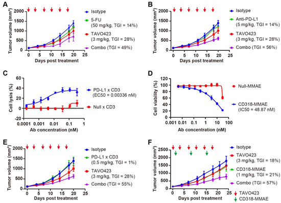 Mice were housed in a specific pathogen-free (SPF) facility in individual ventilated cage (5/cage) on corn cob bedding with crumpled tissue paper for enrichment. The SPF facility maintained a 12:12 light cycle (22 ± 1 °C, 60% humidity). Animals had ad libitum access to irradiated chow and autoclaved water. Health was monitored daily; no abnormalities were observed. For in vivo efficacy studies of the combination therapy involving TAVO423 with anti-PD-L1 mAb or PD-L1 × CD3 bispecific antibody in the RKO xenograft model or 5T4 x CD3 in the BxPC-3-HAS3 xenograft model, human PBMCs containing CD3-positive effector T cells were engrafted into immunocompromised mice five days prior to tumor cell inoculation. After human PBMC reconstitution, tumors were established by injecting 3 × 106 cells into the flanks of 6–10 weeks old female Balb/c nude mice. In other efficacy studies using the RKO xenograft model, Balb/c nude female mice received subcutaneous injections of 3 × 106 RKO tumor cells. Once tumors reached an average volume of 100–150 mm3, mice were randomized (n = 6 or 8) and treated with isotype controls or test agents at specified dosages and regimens. 5-Fluorouracil (5-FU, Shanghai Xudong Haipu Pharmaceutical Co., Ltd., # H31020593, Shanghai, China) and anti-PD-L1 mAb (Atezolizumab, MedChemExpress., # HY-P9904, Shanghai, China) were purchased from external suppliers. The CD318-MMAE ADC was prepared in-house via cysteine conjugation. Other antibodies used in the animal studies were also prepared in-house. The dose levels were selected based on prior in-house dose–response studies showing efficacy without toxicity. The primary outcome was tumor volume reduction. Tumor response was monitored twice weekly by measuring tumor size and mouse body weight. Tumor volumes were measured using calipers, with volumes calculated in mm3 using the formula: V = (L × W × W)/2, where V is tumor volume, L is tumor length (longest dimension), and W is tumor width (perpendicular to L). At the study endpoint, mice were sacrificed, and tumors were excised and weighed to assess tumor shrinkage. For humane endpoints, mice were euthanized if body weight loss >20% or individual mouse with tumor volume exceeding 3000 mm3. Daily monitoring included weight, tumor size, and activity. No severe adverse events (e.g., >20% weight loss) were observed in any group during the study. All procedures involving animal care, handling, and treatment complied with the guidelines of the Institutional Animal Care and Use Committee (IACUC) of Suzhou Charles River Accelerator and Development Lab (Approved Protocols: P202302160002-20240711 and P202302160002-20241219).