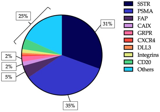 As of 5 July 2025, more than 400 clinical trials investigating RLT were registered on ClinicalTrials.gov. SSTR- and PSMA-targeted agents account for approximately 65% of these studies. Among the other targets most frequently investigated in solid tumours are fibroblast activation protein (FAP), carbonic anhydrase IX (CAIX), and gastrin-releasing peptide receptor (GRPR). Although no RLT agent directed against these targets has yet received regulatory approval, multiple early-phase trials have been completed or are ongoing, with preliminary findings suggesting promising therapeutic activity in several tumour types. Additional investigational targets include chemokine receptor 4 (CXCR4), delta-like ligand 3 (DLL3), folate receptor α (FRα), six-transmembrane epithelial antigen of the prostate 2 (STEAP2), insulin-like growth factor 1 receptor (IGF-1R), melanocortin 1 receptor (MC1R), nectin-4, (human epidermal growth factor receptor 2) HER2, and various cluster of differentiation (CD) antigens. Details of the search strategy and inclusion criteria are provided in the Supplementary Materials. Figure 2 summarises the most commonly explored targets in registered RLT trials.
