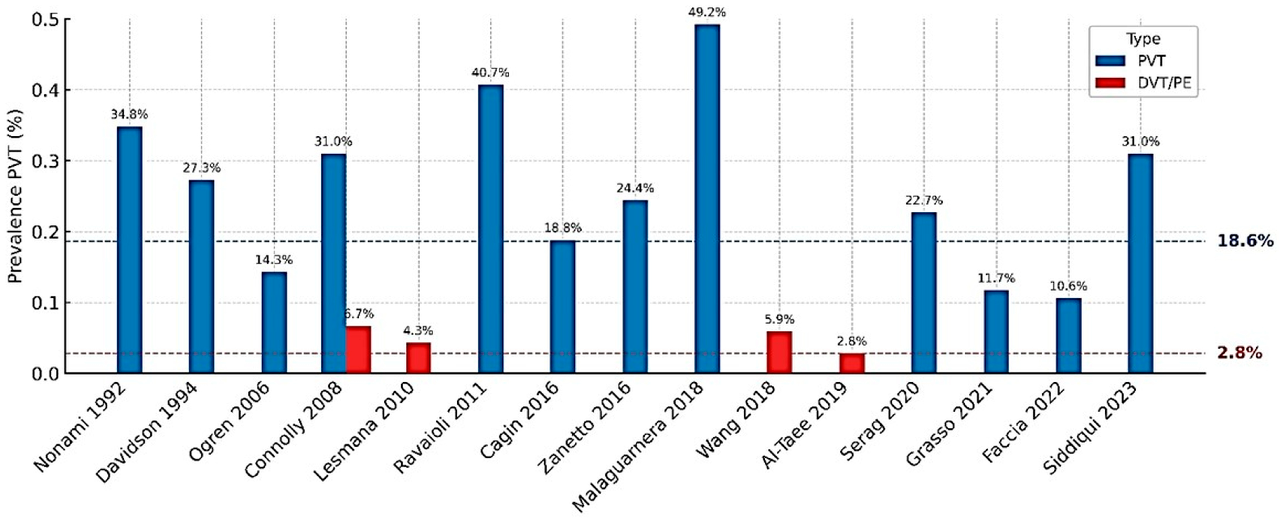 | Tzeng et al. [16] | Retrospective | 2012 | PVT + DVT/PE | 5651 hepatectomies | Surgery | DVT (1.93%), PE (1.31%), venous thromboembolism (VTE) (2.88%). |