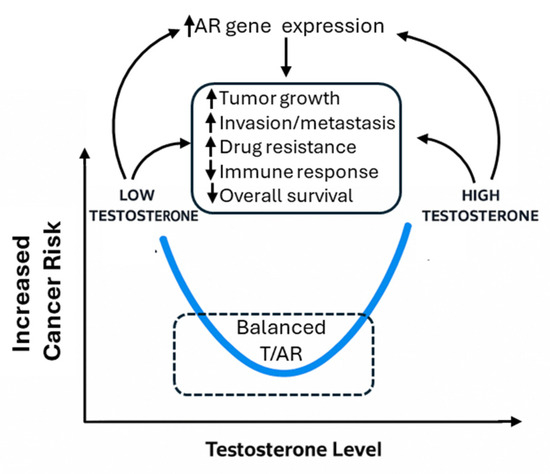 Recently, it was demonstrated that the binding patterns of AR in normal prostate cells on the target genes were significantly different as compared to tumor cells, highlighting a tumor suppressor role of AR in normal tissues, in contrast to a tumor-promoting role in cancer cells [2,6]. Correspondingly, both high and low levels of serum testosterone are linked to prostate cancer risk or worse prognosis [7]. Therefore, a U-shaped relationship was proposed to explain the complex relationship of this key sex hormone with prostate cancer [8]. In this review, we adopt this hypothesis and propose that the T/AR axis contributes to sex disparities in non-reproductive cancers not linearly, but in a context- and cancer-type-dependent manner, potentially also following a U-shaped model (Figure 1).