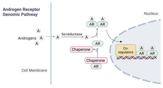 Inactive forms of AR are typically found in the cytoplasm, bound to heat shock proteins (HSPs); such an association ensures proper folding of AR [17,18]. Upon entry of androgens (such as T) into target cells by passive diffusion and binding to AR LBD, the AR undergoes a conformational change, leading to its dissociation with HSPs, homodimerization, translocation into the nucleus, and activation of AR-target genes [19] (Figure 2). Downstream signaling cascades are activated through two different mechanisms: the canonical (or genomic) pathway (Figure 2) and the non-genomic pathway [20].