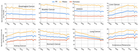 Male predominance is found in multiple cancers in non-reproductive systems, including esophageal cancer, bladder cancer, head and neck cancer, liver cancer, oral larynx cancer, kidney cancer, and stomach cancer (Table 1). Using the data from the Surveillance, Epidemiology, and End Results (SEER) Program of the National Cancer Institute (downloaded by SEERStat9.0.41 software), the age-standardized incidence rates (ASRs) in men and women from 2000 to 2022 are plotted in Figure 4. Esophageal (SEER site code C15) and bladder cancers (C67) exhibited the greatest sex differences, more than fourfold of ASR in males as compared to females (M/F ratio), followed by head and neck cancer (C00–C14 and C32, with an M/F ratio of 2.84), liver cancer (C22), kidney cancer (C64.9), stomach cancer (C16), and cutaneous melanoma (C44). Major cancer types with an M/F ratio > 1.5 are included in this review, as well as highly prevalent lung cancer, which had an M/F ratio of 1.37.