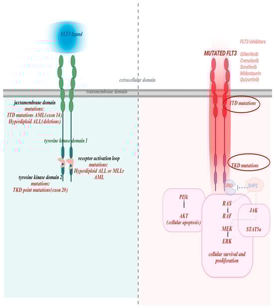 FLT3 structure, mutations and targeted drugs with their binding domains. The left panel illustrates the structure of the wild-type FLT3 receptor, consisting of an extracellular domain that binds FLT3 ligand, a transmembrane domain, juxtamembrane domain and tyrosine kinase domains with the activation domain loop. It also highlights key mutational hotspots: juxtamembrane domain (exon 14): site of internal tandem duplication (ITD) mutations, common in AML, and associated with hyperdiploid ALL (via deletions); Tyrosine kinase domain 2 (exon 20): harbors TKD point mutations, seen in AML; Receptor activation loop: mutations observed in hyperdiploid ALL and MLL-rearranged AML. The right panel pictures mutated FLT3and all of the drugs active against both types of mutations. Also depicts multiple downstream pathways critical for leukemogenesis: STAT5A-signal transducer and activator of transcription 5A; PIK-gene provides instructions for cell growth, division, and survival; SHP2-protein crucial for cell growth, differentiation and movement by regulating the RAS/MAPK signaling pathway [11]. This figure was generated using Biorender (https://www.biorender.com) (accessed on 20 October 2025).