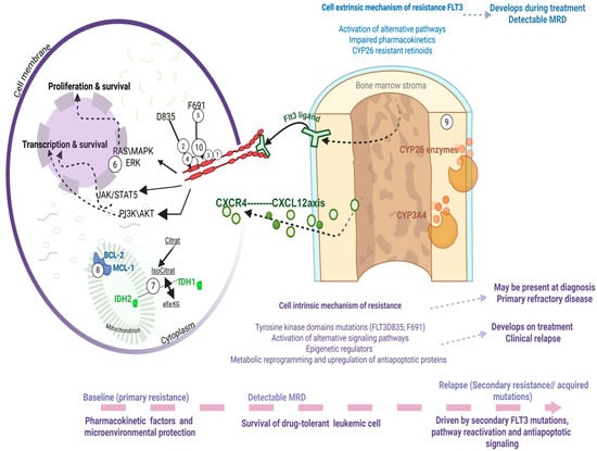 The incorporation of FLT3 inhibitors into frontline therapy and the dominant role of gilteritinib in the relapsed/refractory setting have significantly reshaped the landscape of clinical resistance in FLT3-mutant AML. Despite these advances, relapse remains common, and for many patients it represents a fatal event. Thus, clinical resistance to FLT3 inhibitors remains both a pressing unmet need and an area of intense investigation. Conceptually, resistance can be divided into two broad categories: cell-intrinsic mechanisms, arising from genetic, signaling, or metabolic adaptations within leukemic cells, and cell-extrinsic mechanisms, driven by the protective effects of the bone marrow microenvironment and pharmacologic limitations. Both forms of resistance may be present at diagnosis (primary refractory disease) or emerge under therapeutic pressure (relapsed/refractory disease) (Figure 2). Over the last decade, multiple comprehensive reviews have detailed these mechanisms [19]. In this section, we will highlight the most recent insights and emphasize those resistance mechanisms most relevant to ongoing clinical development, while pointing the reader to excellent manuscripts that provide in-depth discussion of specific aspects.
