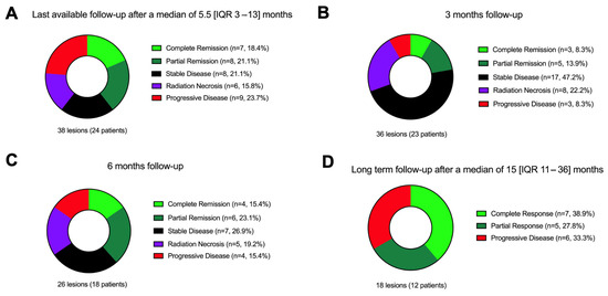 Local tumor control after SRS therapy divided into the following: (A) Last available follow-up after a median of 5.5 months. (B) A 3-month follow-up. (C) A 6-month follow-up. (D) Long-term follow-up after a median of 15 months. Abbreviations: CR = complete response, PR = partial remission, SD = stable disease, RN = radiation necrosis (both, definite and MRI-based), PD = progressive disease.