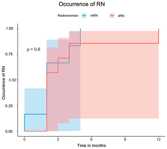 Curve for the occurrence of RN stratified according to mRN and dRN. Abbreviations: RN = radiation necrosis, dRN = definitive RN (PET- or histology-confirmed), mRN = MRI-based RN.