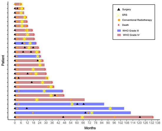 Swimmer plot illustrating individual patient timelines from first diagnosis to last follow-up or death. Each bar represents a patient, with segments indicating the timing of each intervention (surgery, conventional radiotherapy, stereotactic radiosurgery). Therapeutic modalities such as chemotherapy were omitted for clarity. In all cases the recurrence diagnosis was made immediately prior to the subsequent therapy. Abbreviations: SRS = stereotactic radiosurgery.