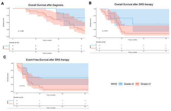 Median overall survival (OS) was 29.5 months [IQR 17.6–46.3]; post-SRS OS was 9.6 months [IQR 4.5–13.4]. Twenty-one patients (77.8%) died during follow-up. Due to limited distinction between pseudoprogression, RN, and tumor progression, all were considered events in calculating local EFS, with a median of 5.2 months [IQR 2.8–8.5]. Kaplan–Meier curves stratified by WHO grade are shown in Figure 5.