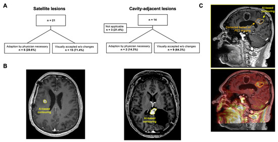 AI-based GTV segmentation. (A) Overview and results of AI-based segmentation, stratified by satellite lesions and cavity-adjacent lesions. (B) Two examples without the need for manual modifications: MRI imaging of a satellite lesion on the left and a cavity-adjacent lesion on the right. (C) Exemplary case, where AI was deemed not applicable, since the target could not be defined by contrast enhancement alone. Contrast-enhanced T1-weighted MRI with corresponding PET imaging below, showing the AI-generated contour (yellow) and manual PET-guided segmentation (orange). This case underscores the need for additional clinical or imaging data—such as sequential MRIs or PET—to accurately delineate targets near the resection cavity.