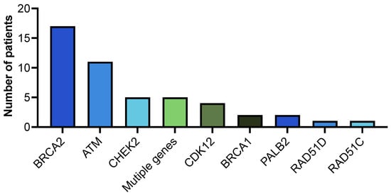 Somatic HRR alterations were most frequently identified in the BRCA2 gene (n = 17), followed by ATM (n = 11). Five patients had CHEK2 and multiple gene alterations.
