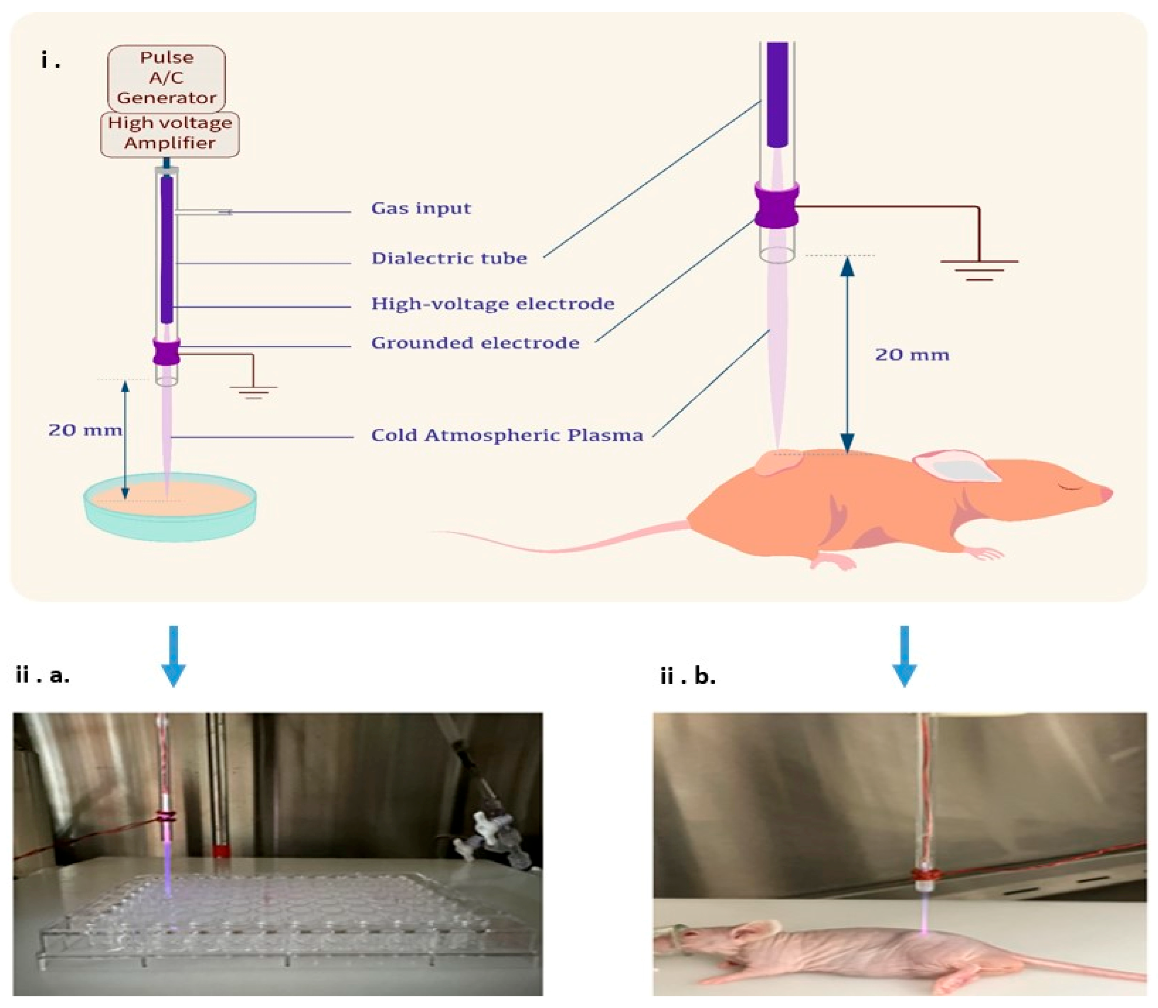 Figure 1) was custom-built by our team at the University of Wisconsin–Madison and optimized for both in vitro and in vivo applications. The system operates as a jet-type CAP generator, utilizing helium as the carrier gas, with a flow rate adjustable between 0 and 3 standard liters per minute (slm). High-voltage pulses ranging from −10 kV to +10 kV at a frequency of up to 20 kHz are applied, enabling precise modulation of plasma intensity. The nozzle-to-target distance can be adjusted from 10 mm to 100 mm, offering flexibility to tailor treatment conditions for different experimental setups.