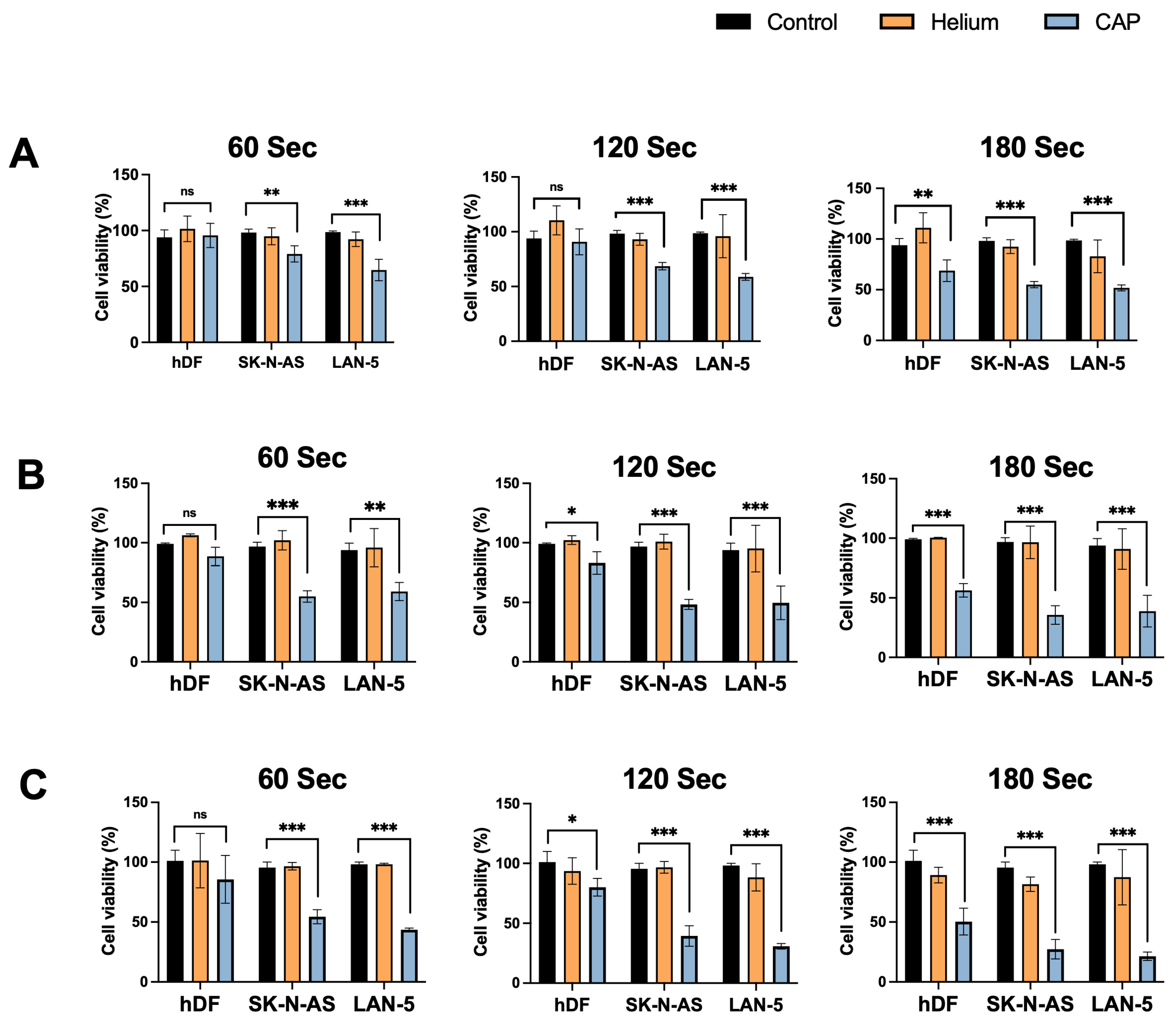 C11-BODIPY 581/591 (Catalog No. D3861, Invitrogen, Thermo Fisher Scientific, Waltham, MA, USA), a fluorescent probe, was used to measure lipid peroxidation and antioxidant efficacy in living cells. hDF and NB cells were cultured in their respective media. C11-BODIPY 581/591 was added to the cells post-CAP treatment or Helium-treatment for 60, 120, and 180 s, alongside untreated controls, at a final concentration of 10 µM. After an hour of incubation, fluorescence intensity was measured using the microplate fluorescence reader (Molecular Devices, San Jose, CA, USA).
