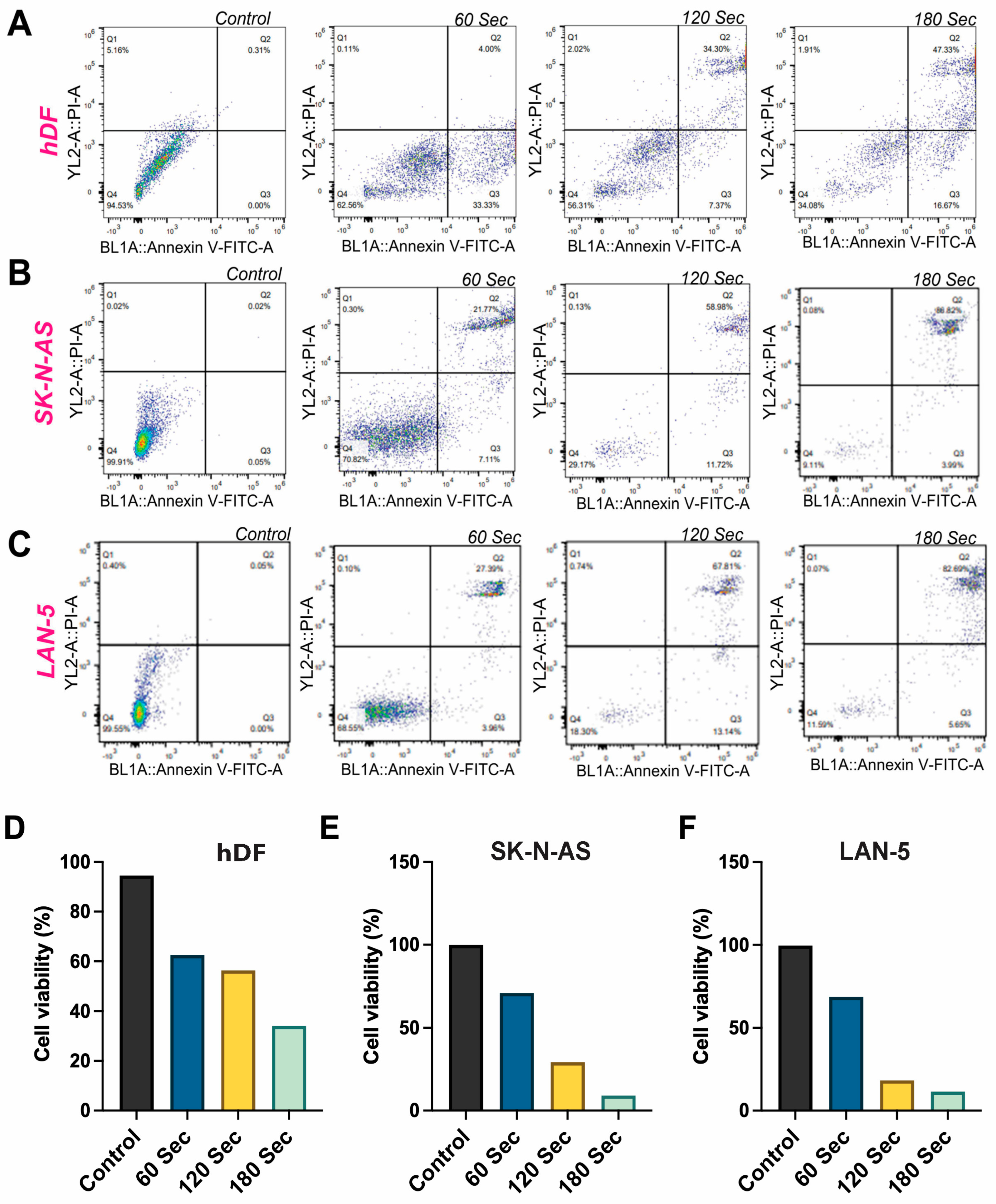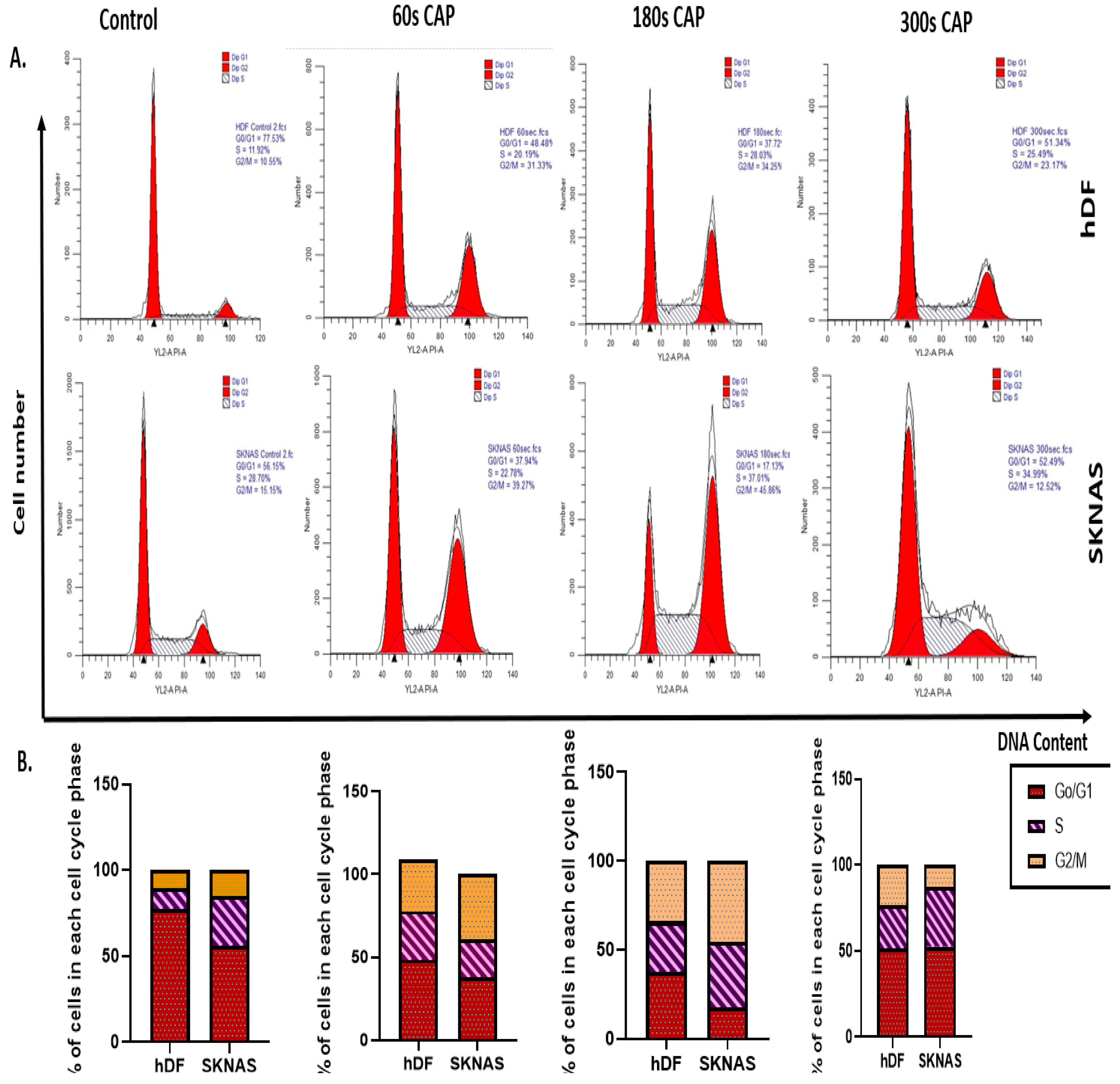 A total of 10,000 hDF and SK-N-AS cells were seeded into each of the 96 wells. The cells were allowed to grow and proliferate for 24 h. The cells were then treated with CAP for 60, 180, and 300 s and incubated for 24 h. Control cells received no CAP treatment. After incubations, the cells were trypsinized and prepared for cell cycle analysis. At 300 s, SK-N-AS cells showed partial redistribution, likely due to checkpoint adaptation, contrasting with a stronger arrest at 180 s.