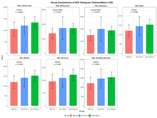 While no statistically significant differences in ADC values were observed among the three groups (p > 0.05), several features showed overall potential trends toward variation, including ADCmaximum (p = 0.075), ADCmean (p = 0.079), ADCmedian (p = 0.060), ADCminimum (p = 0.070), ADCrootmeansquared (p = 0.084), ADC10Percentile (p = 0.065), and ADC90Percentile (p = 0.075) (Figure 2).