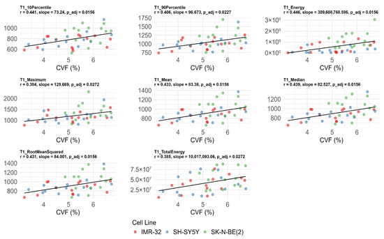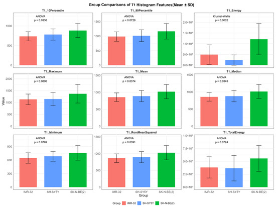 In contrast, several T1 histogram features exhibited overall statistically significant differences among the three groups, including T1energy (p < 0.001), T1mean (p = 0.037), T1median (p = 0.034), T1rootmeansquared (p = 0.039), and T110Percentile (p = 0.034). Additionally, T1maximum (p = 0.090), T1minimum (p = 0.077), T1totalenergy (p = 0.072), and T190Percentile (p = 0.073) demonstrated suggestive trends of variation (Figure 3). Post hoc pairwise analysis revealed significant differences between IMR-32 and SK-N-BE(2) in T110Percentile (adjusted p = 0.030), T1energy (adjusted p = 0.008), T1mean (adjusted p = 0.042), T1median (adjusted p = 0.042), and T1rootmeansquared (adjusted p = 0.044). A significant difference in T1energy was also found between SH-SY5Y and SK-N-BE(2) (adjusted p = 0.002).