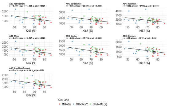 Significant negative correlations were observed between Ki-67 expression and multiple ADC values after FDR correction, including ADC10Percentile (r = −0.397, adjusted p = 0.032), ADC90Percentile (r = −0.394, adjusted p = 0.032), ADCmaximum (r = −0.362, adjusted p = 0.048), ADCmean (r = −0.421, adjusted p = 0.032), ADCmedian (r = −0.422, adjusted p = 0.032), ADCminimum (r = −0.390, adjusted p = 0.032), and ADCrootmeansquared (r = −0.419, adjusted p = 0.032) (Figure 4). No significant correlations were found between ADC values, MVD, and CVF after FDR correction (adjusted p > 0.05) (Table 2).