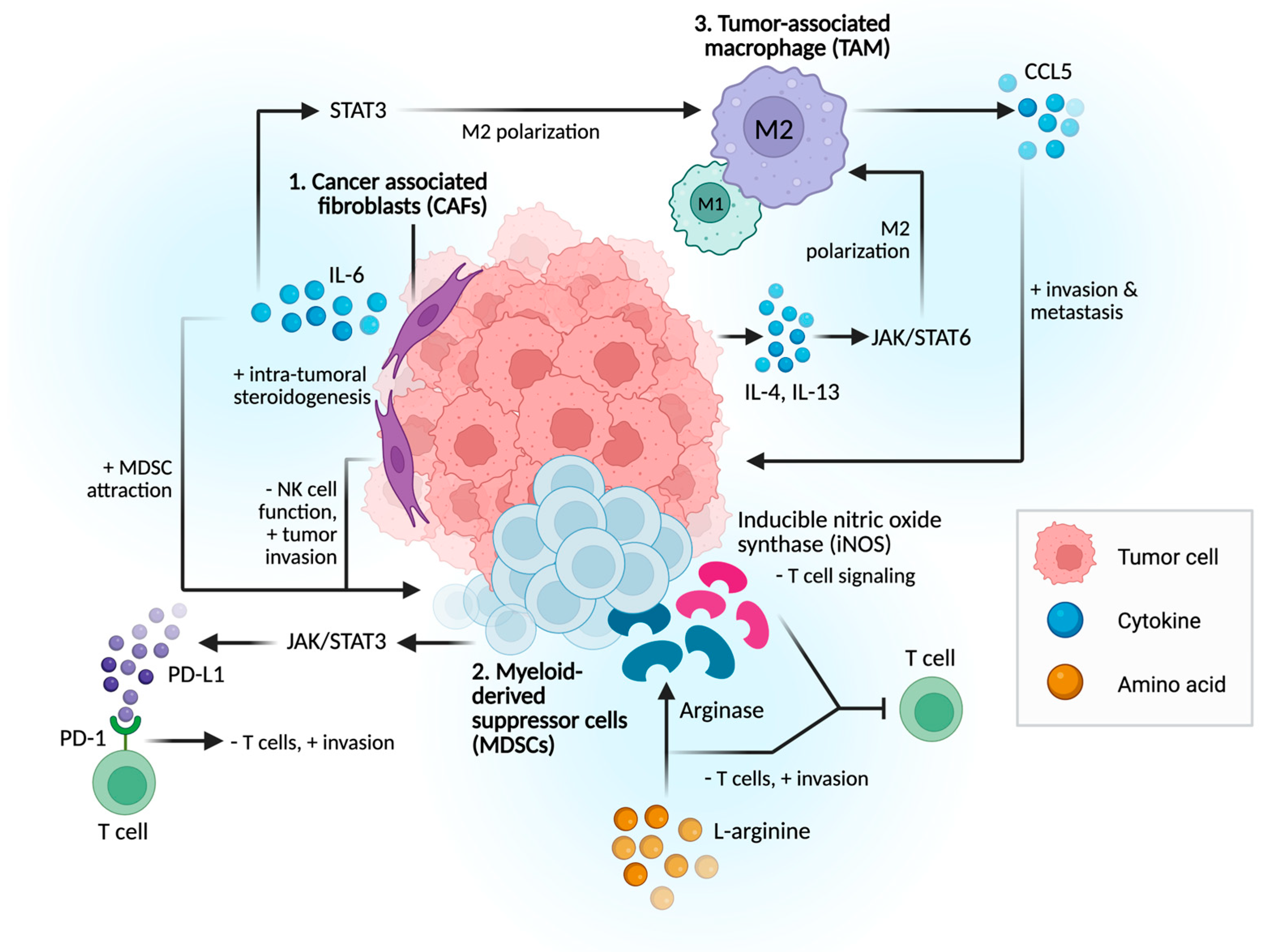 2.1. Immunosuppressive Cells and Signaling Pathways