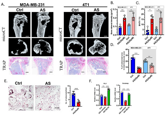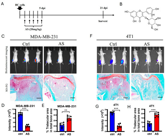 To detect whether AS affects bone metastasis in BC, 4T1 cells, a murine BC cell line, and MDA-MB-231 cells, a human BC cell line, were injected into the tibias of Balb/c mice and nude mice, respectively. Then, AS was injected intraperitoneally for 5 consecutive days (Figure 1A,B). Using bioluminescence imaging (BLI), we found that the lesion sizes at the tibias of mice were significantly decreased after treatment with AS. Consistently, trabecular area was preserved after treatment with AS (Figure 1C–H). Taken together, these findings indicate that AS attenuated bone metastasis in BC.