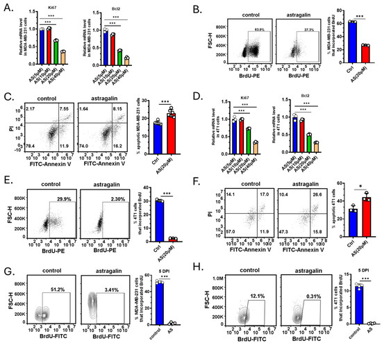 AS inhibited BC cell growth. (A) Real-time PCR detecting the mRNA levels of ki-67 and Bcl-2 in MDA-MB-231 cells after treatment with AS (5, 10, 20, and 40 µM) for 48 h. (B) Representative flow cytometry images showing BrdU incorporation in MDA-MB-231 cells after treatment with AS (20 µM) or vehicle (left) and the quantification results (right). (C) Representative flow cytometry images showing the apoptotic rate in MDA-MB-231 cells after treatment with AS (20 µM) or vehicle (left) and the quantification results (right). (D) Real-time PCR analysis detecting the mRNA levels of ki-67 and Bcl-2 in 4T1 cells after treatment with AS (5, 10, 20, and 40 µM) for 48 h. (E) Representative flow cytometry images showing the proportion of BrdU incorporation in 4T1 cells after treatment with AS (20 µM) or vehicle (left) and the quantification results (right). (F) Representative flow cytometry images showing the apoptosis rate in 4T1 cells after treatment with AS (20 µM) or vehicle (left) and the quantification results (right). (G,H) MDA-MB-231 cells or 4T1 cells were labeled with Dil dye and then injected into the tibias. Flow cytometry analysis detecting BrdU incorporation in MDA-MB-231 cells (G) or 4T1 cells (H) after treatment with AS (40 mg/kg) or vehicle at a specific time point. AS, astragalin; ctrl, control. * p < 0.05; *** p < 0.001.