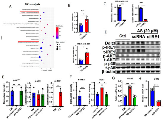 GO analysis indicated that “response to endoplasmic reticulum stress” and “endoplasmic reticulum unfolded protein response” were significantly changed in the AS-treated group compared to the control group (Figure 4A). Interestingly, Ddit3 was found to be involved in endoplasmic reticulum stress; thus, we hypothesized that endoplasmic reticulum stress may regulate the expression of Ddit3 after treatment with AS. As expected, the mRNA expression of IRE1 was significantly upregulated in 4T1 cells and MDA-MB-231 cells (Figure 4B). Then, the knockdown of IRE1 was demonstrated at the mRNA level in MDA-MB-231 cells and 4T1 cells (Figure 4C). Western blotting indicated that the protein levels of Ddit3 and the phosphorylation levels of IRE1 were markedly upregulated in the AS-treated group (Figure 4D,E, Supplementary Document S1–S4). Since the ATK pathway and the p38 MAPK pathway are downstream of IRE1, we detected the activation status of these pathways after IRE1 knockdown. IRE1 knockdown significantly downregulated the protein levels of total IRE1 (Figure 4D,E). In addition, treatment with AS significantly inhibited the levels of phosphorylated AKT but had little effect on p38 MAPK activation (Figure 4D,F). In addition, phosphorylated AKT was upregulated after IRE1 knockdown (Figure 4D,F). These results suggest that AS can regulate the activation of IRE1 and the AKT pathway in 4T1 cells. Furthermore, IRE1 knockdown was found to reverse the effects of AS on the mRNA expression of Ddit3 (Figure 4G). Similarly, activation of the AKT pathway reversed the effects of AS on the mRNA expression of Ddit3 (Figure 4H). Taken together, we found that the IRE1-AKT pathway plays a key role in AS-mediated regulation of Ddit3 expression in 4T1 cells.
