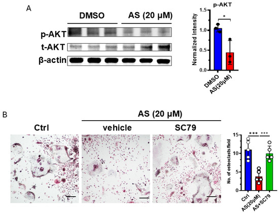 Cells derived from bone marrow were rinsed out, filtered, and cultured with M-CSF (50 ng/mL) for 24 h. Then, non-adherent cells were transferred to new culture plates and cultured with M-CSF (50 ng/mL) and RANKL (100 ng/mL) to obtain bone marrow macrophages/monocytes (BMMs) [19]. In some experiments, SC79 was added to treat BMMs cells at 20 μM for 24 h, and then AS (20 μM, MedChemExpress LLC) or its vehicle, DMSO, was added. When detecting osteoclast formation, the cells were fixed in 4% paraformaldehyde for 30 min and then stained with TRAP staining solution (Wako, Japan), following the manufacturer’s instructions.