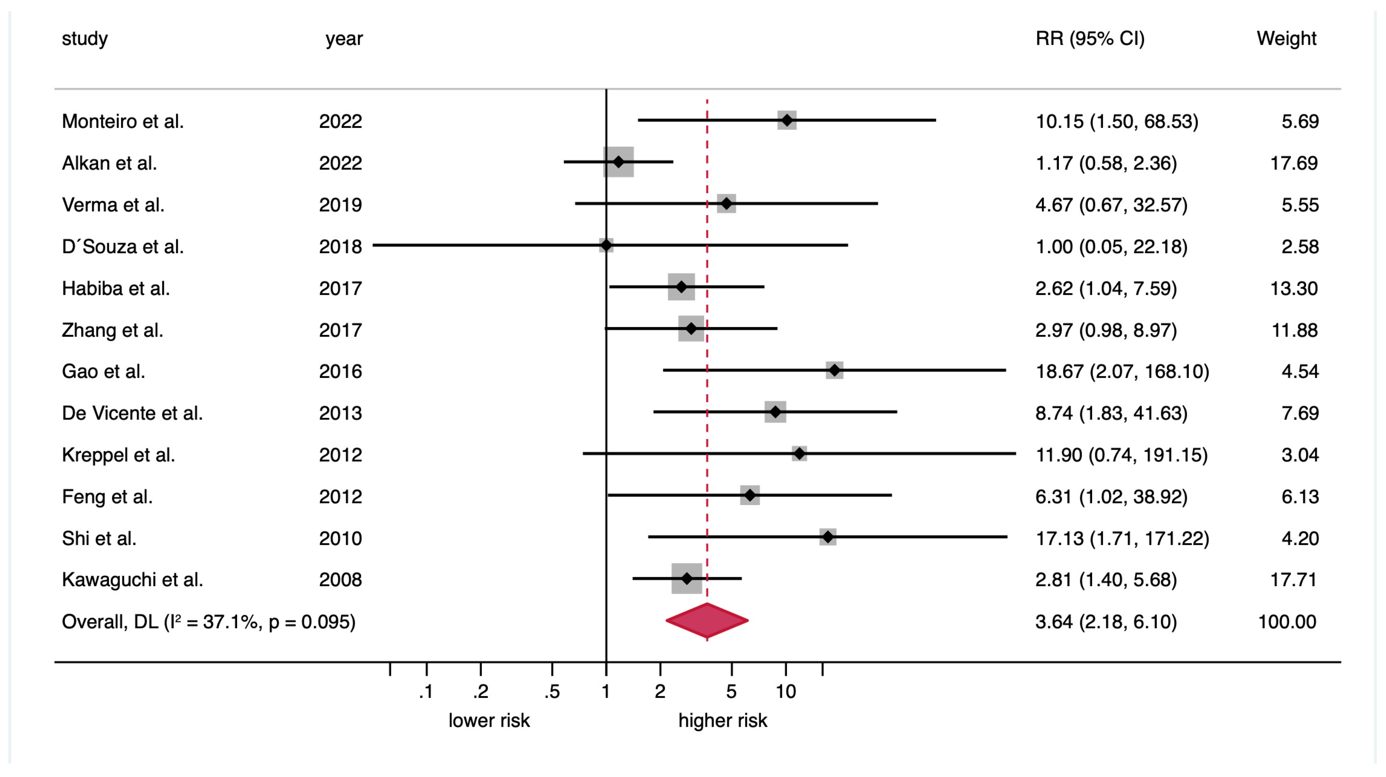 | Malignant transformation risk a | 12 | 857 | REM | D-L | RR = 3.64 (2.18–6.10) | <0.001 | 0.10 | 37.1 |